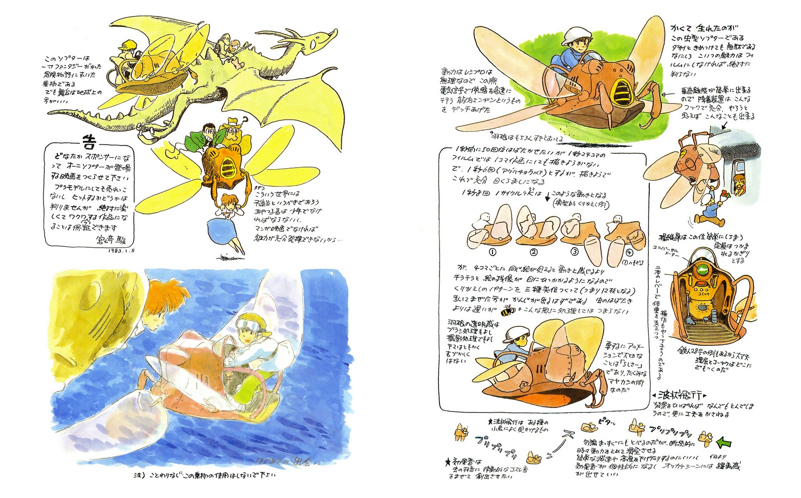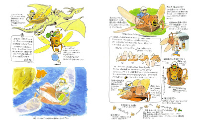 Here's a look at Miyazaki's ideas for flying machines from his 1983 book, Image Boards. This is an excellent example of how many ideas are fleshed out years before finding a home in a television series or movie. The highlight for me are the illustrations of the bug-like flying machine that eventually finds a home in Castle in the Sky in 1986. This aircraft was very thoroughly conceived by Miyazaki; observe how he describes how the wings and the control panels work. The bug arms are eventually removed, but that's the only change.